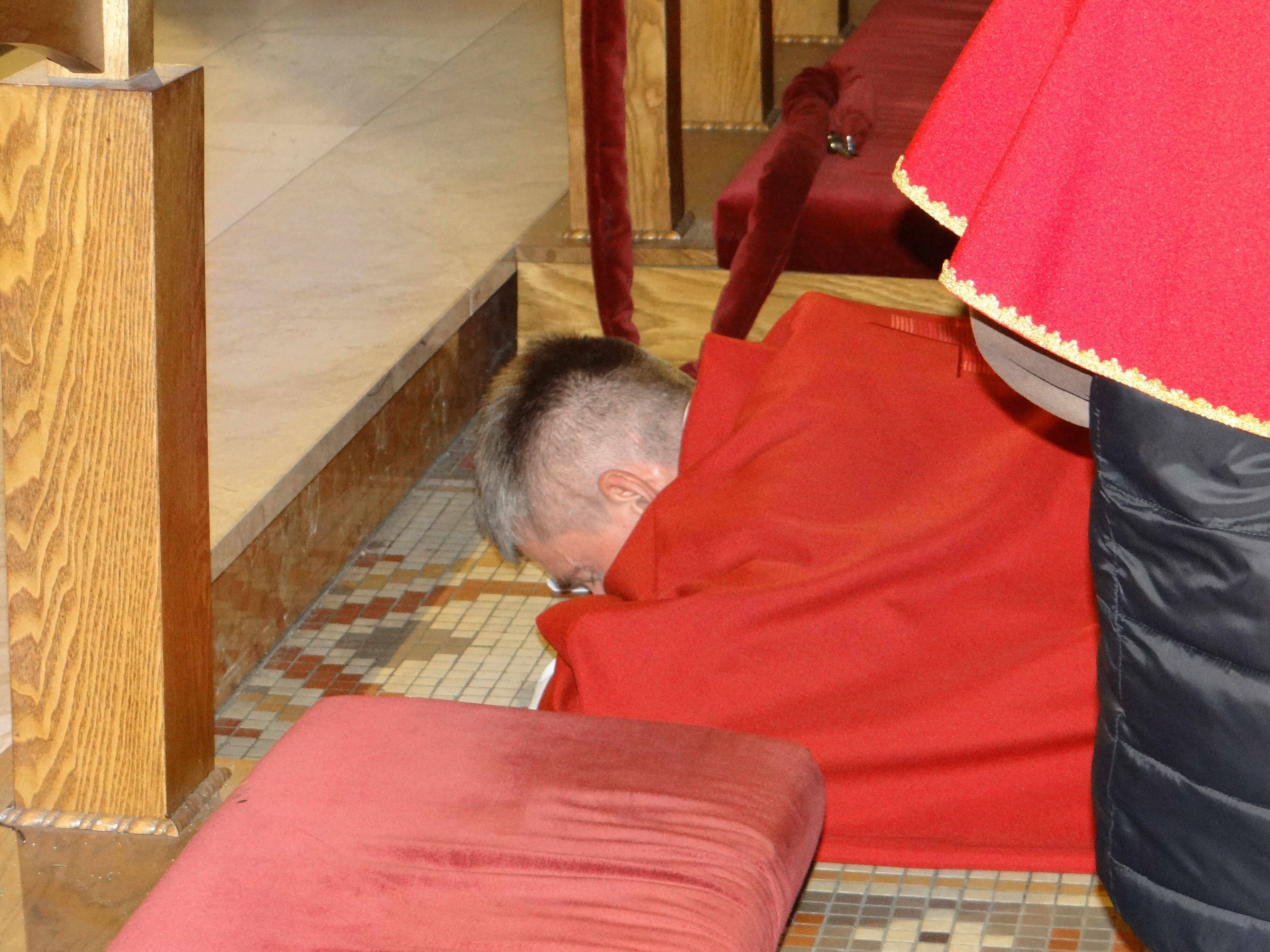 Obrzędom przewodniczył wikariusz parafii, ks. Łukasz Gawrzydek. Liturgia rozpoczęła się w ciszy – asysta udała się do ołtarza, oddając cześć Najświętszemu Sakramentowi przechowywanemu w Ciemnicy. Następnie celebrans, w geście głębokiej pokory i oddania, upadł na twarz przed ołtarzem. W całej świątyni zapanowała przejmująca cisza, sprzyjająca modlitewnej zadumie.