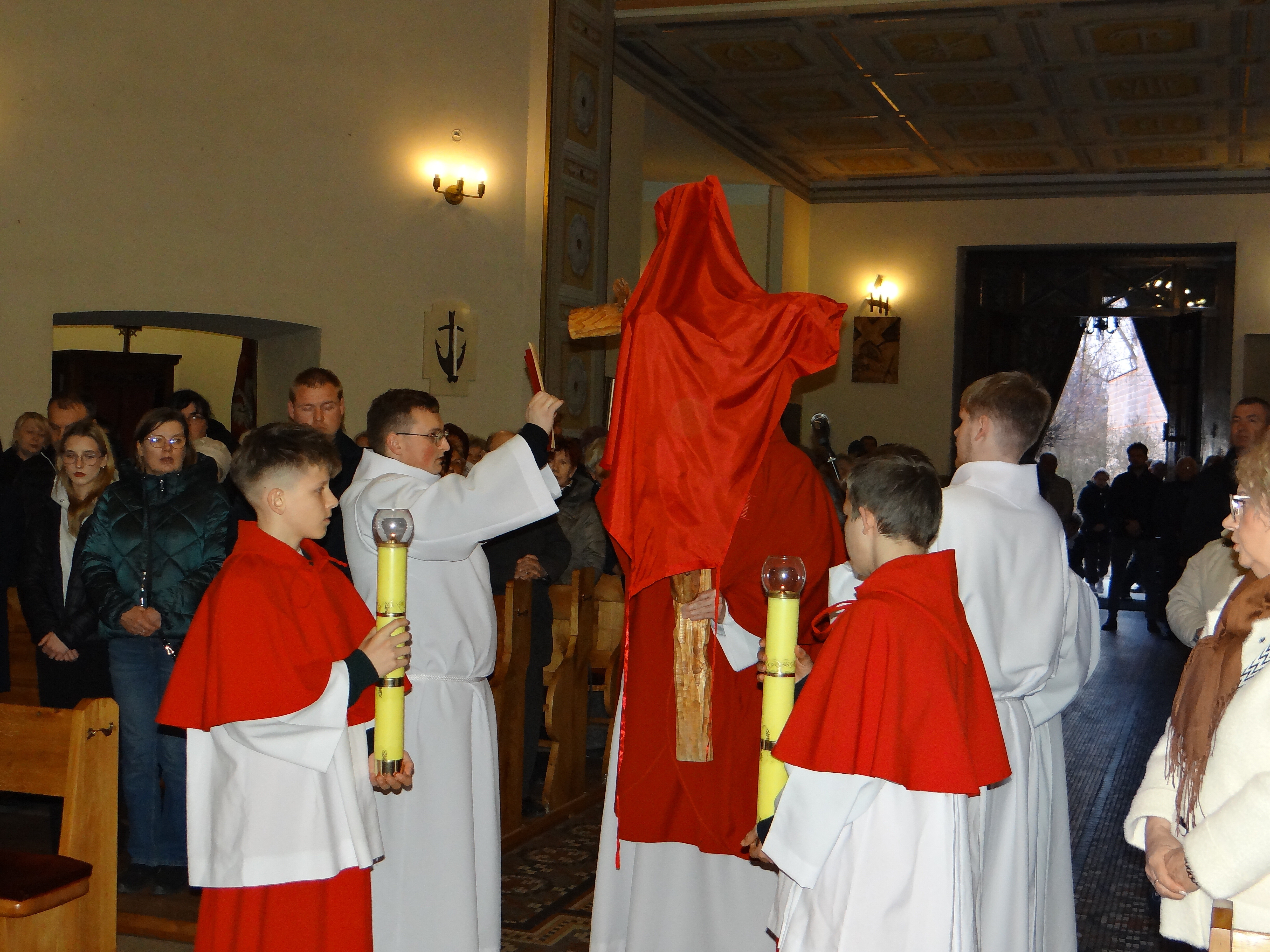 Po modlitwie wstępnej rozpoczęła się Liturgia Słowa. Dzisiejsze czytania ukazały dramat niesprawiedliwego wyroku, cierpienie oraz ofiarę życia Jezusa Chrystusa za nasze grzechy. Szczególnie poruszającym momentem było odczytanie Męki Pańskiej według św. Jana. W chwili, gdy zabrzmiały słowa Jezusa: „Wykonało się”, wszyscy wierni uklękli i trwali w milczeniu, wyrażając wdzięczność za zbawczą śmierć Chrystusa na krzyżu.