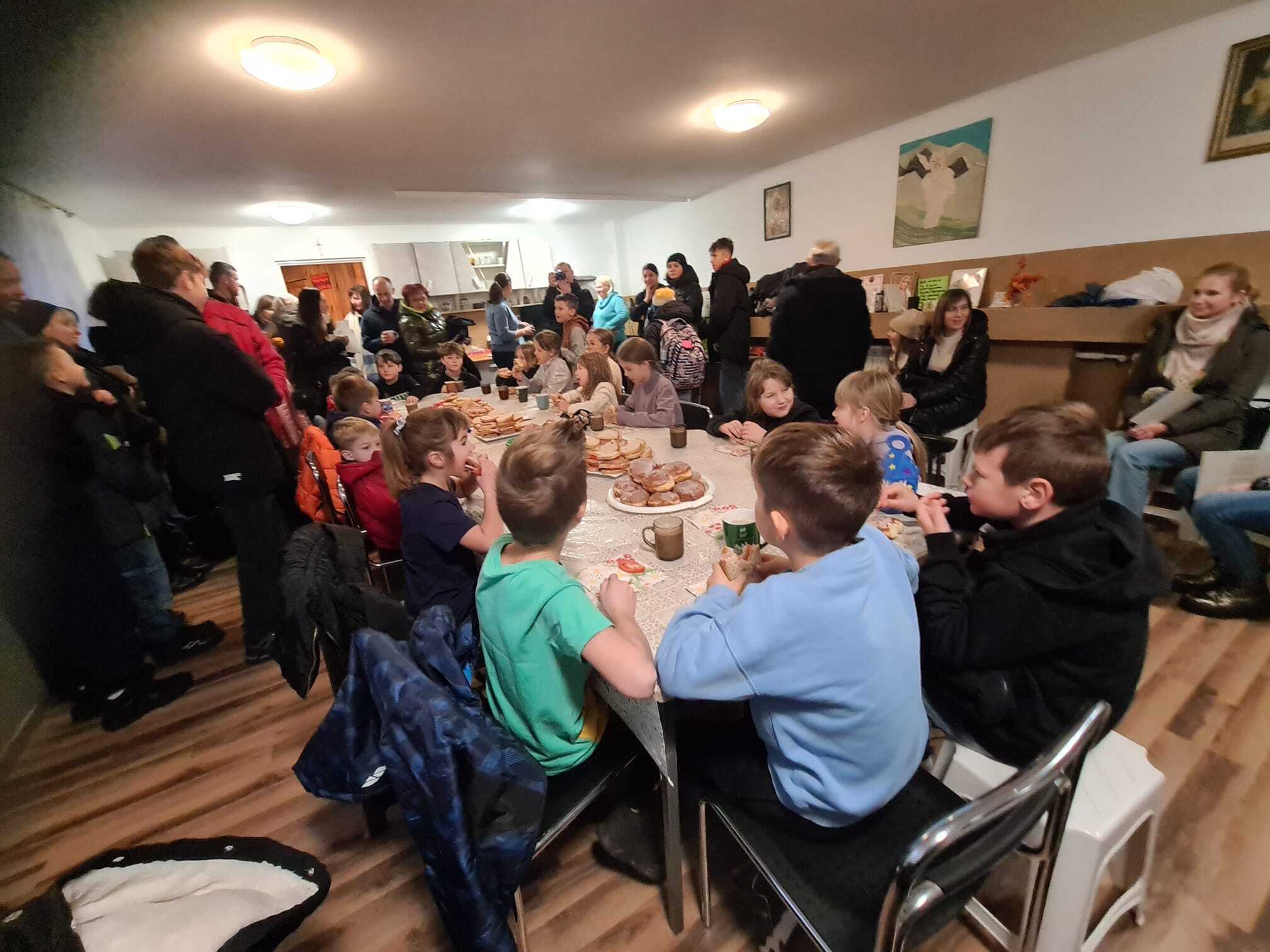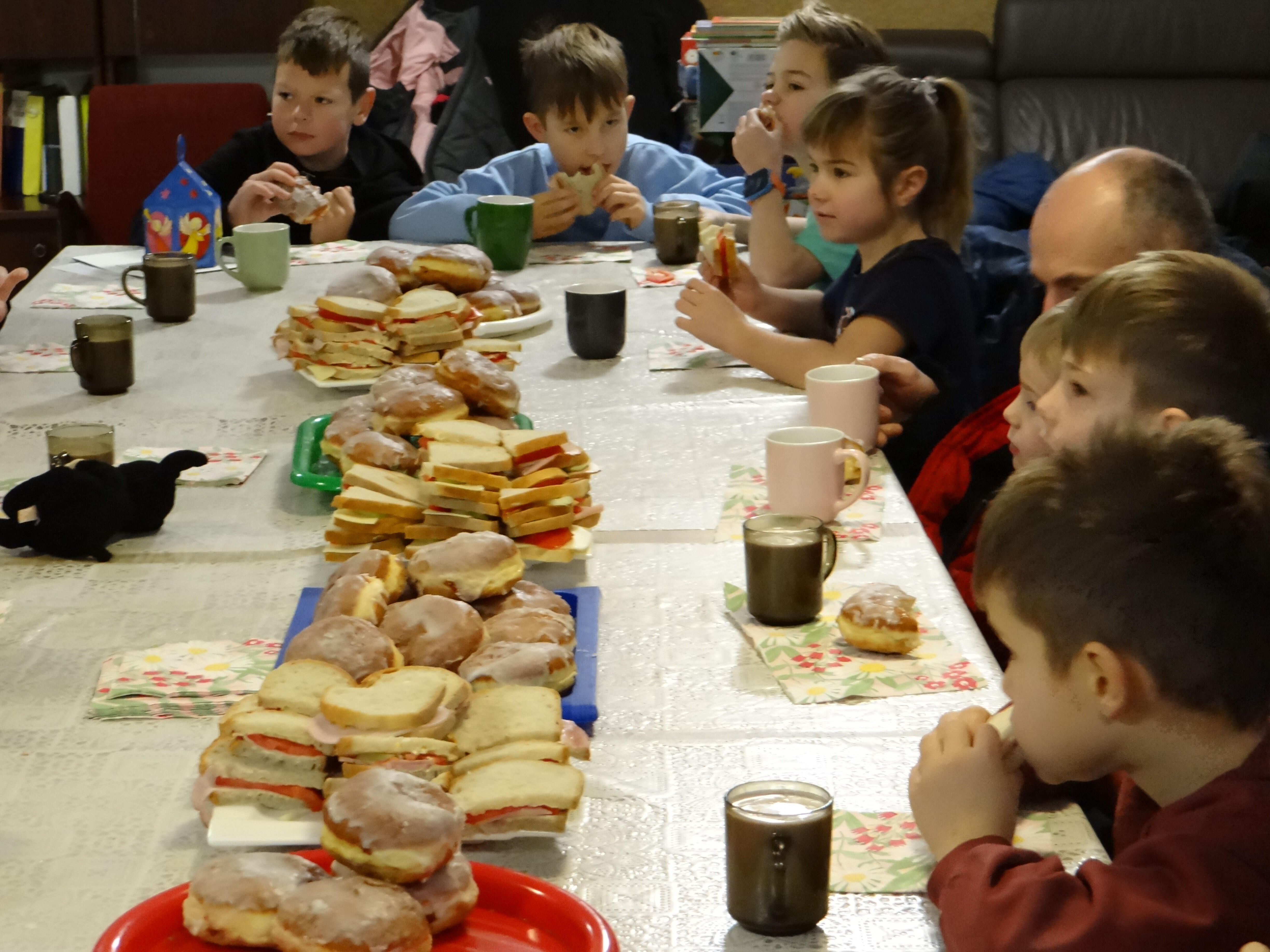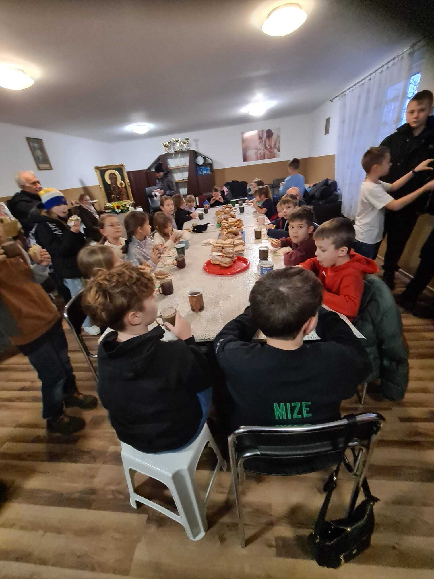 Po zakończonej Mszy, jak co roku, dzieci wraz z rodzicami i opiekunami spotykają się na salce katechetycznej na ciepłe, pyszne śniadanie. Ten wspólny posiłek to piękny moment integracji. Dzieci oraz dorośli dzielą się wrażeniami a przy tym zbierają siły na cały rozpoczynający się dzień. Widać na ich twarzach jak maluje się radość i duma z porannego trudu wczesnego wstania i podjętego wyrzeczenia. Po śniadaniu nasi milusińscy z pełnymi brzuszkami ruszają dalej, by rozpocząć lekcje.